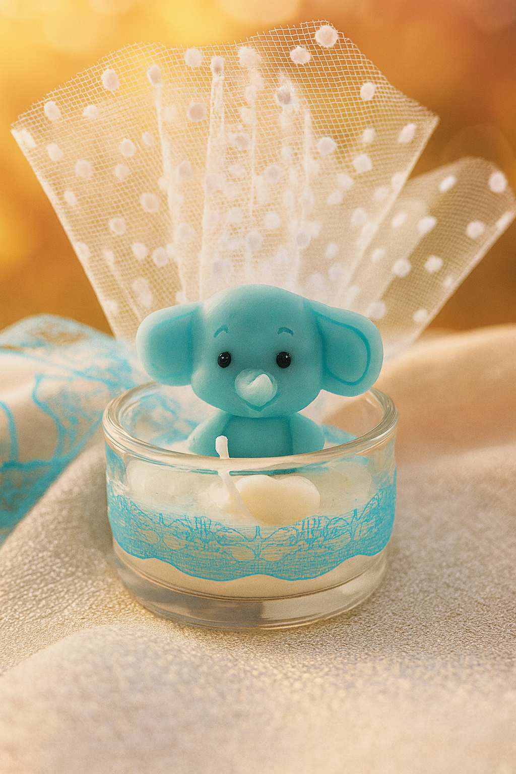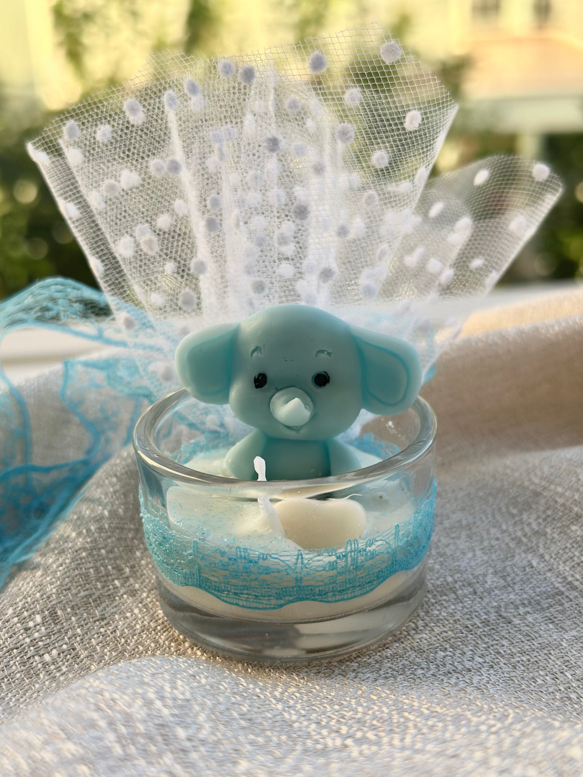 Χειροποίητο γυάλινο βαζάκι με κερί ελεφαντάκι. Μια γλυκιά και ιδιαίτερη μπομπονιέρα για βάφτιση αγοριού ή baby shower.
